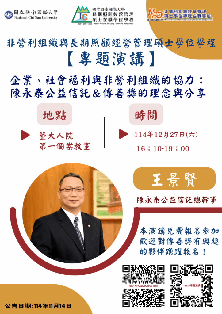 114-1學期【專題演講 】主講人:王景賢總幹事 主題:企業、社會福利與非營利組織的協力:陳永泰公益信託&傳善獎的理念與分享